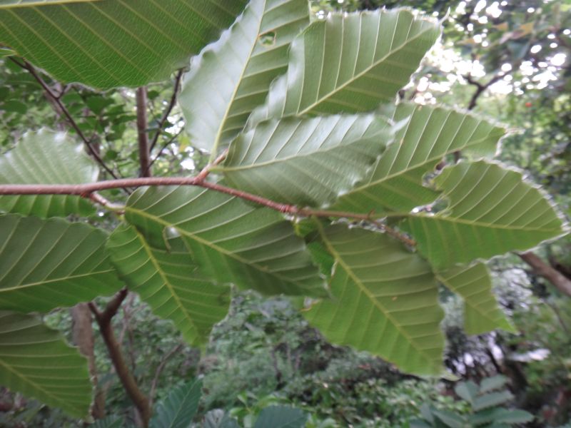 イヌブナ:ひこばえ多い、樹皮黒褐色、側脈10〜14対、果実下垂。
