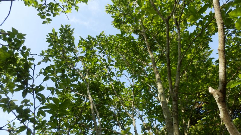 樹皮は灰白色で平滑であり、地衣類がついていることが多い。