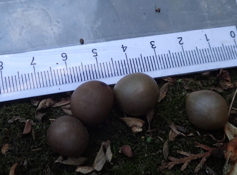 球形で褐色の殻に入った種子を出す。