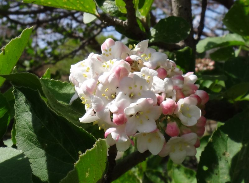 春に枝先の集散花序に淡紅色を帯びた白色の香りのよい花を多数つける。