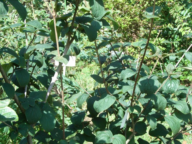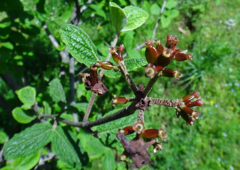 チョウジガマズミ :落葉、葉柄に星状毛、托葉なし、鋸歯、葉先のとがり鈍い、花高坏状、核果黒熟。