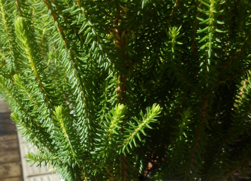 葉は短くて太い針のような形であり、若い幹は赤褐色。