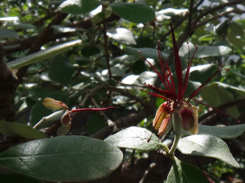 白い4弁花が咲き、真っ赤な花糸が束生する。