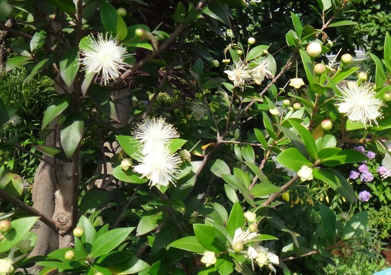 葉は卵形で芳香があり、長い雄しべが多数ある白い5弁花が咲く