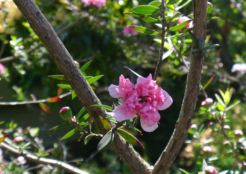 葉は狭楕円形でやや固く、枝先に白や紅色の花が咲き、