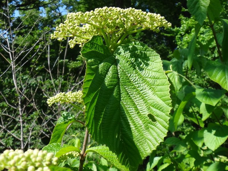 オオミヤマガマズミ:落葉、葉柄1〜2センチで絹毛、葉が大きく長毛散生、葉先鋭くとがる、鋭鋸歯。
