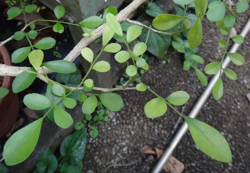 小葉は長さ2〜4.5センチの倒卵形で、革質で光沢があり、全縁で、