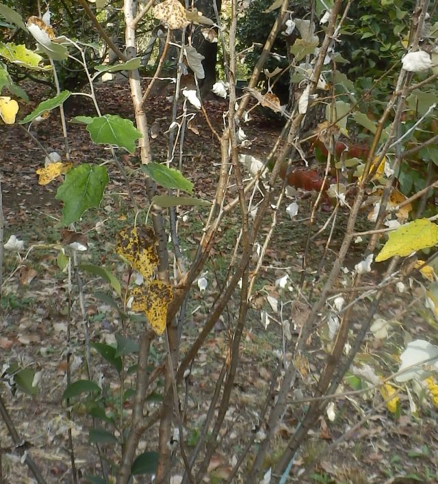 幹は褐色の樹皮がひび割れて、白地に褐色の菱形模様がついたようになる。