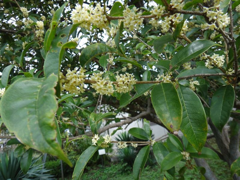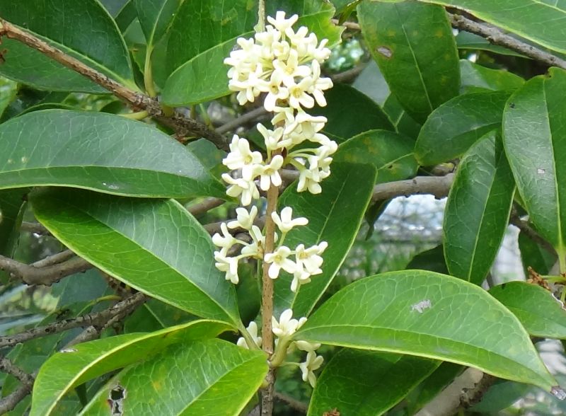 ギンモクセイ:花はクリーム色でやや疎、芳香弱、葉は8〜15センチで鋸歯、果実長は1〜1.5センチ。