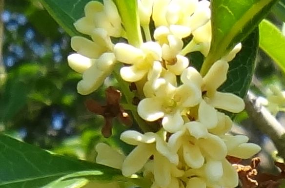 雌雄異株で、秋に葉腋に芳香のある小さい白〜クリーム色の花を束生する。