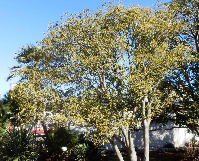 葉は先の尖った楕円形で、革質である。この木では鋸歯がない。
