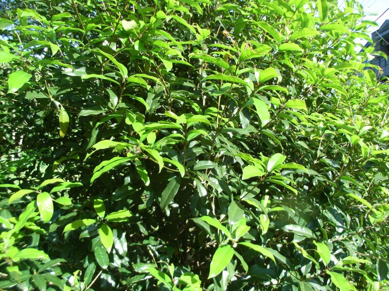 キンモクセイ:花はオレンジ色で密集、芳香強、葉は5〜9センチで全縁、結実せず。