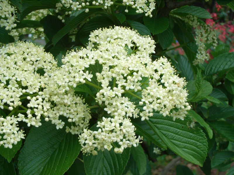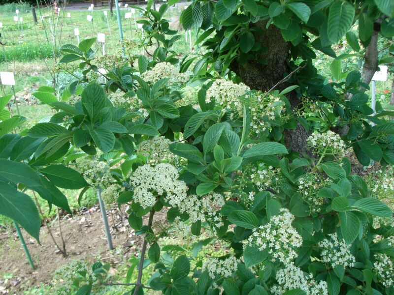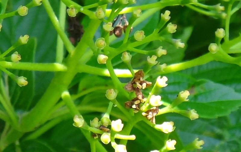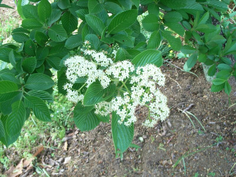 枝先の円錐花序に直径7〜9ミリの高坏状の白い花を多数つける。