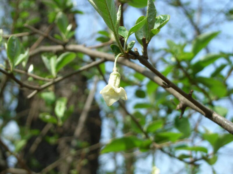 春に淡黄色の花が咲き、初夏に長さ1.5〜2センチの大きな実がつき、枝に棘がない