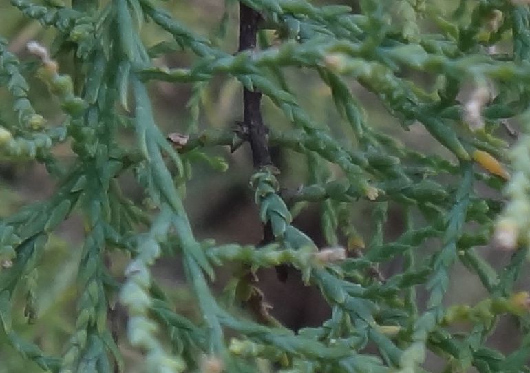 長さ1〜3ミリの鱗片状の葉が細い枝に密着して互生する。