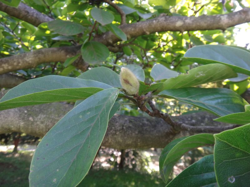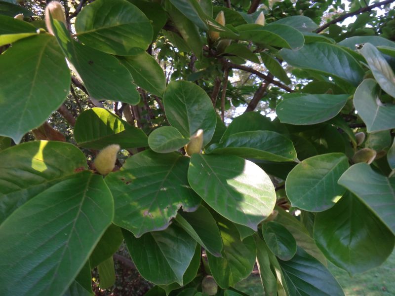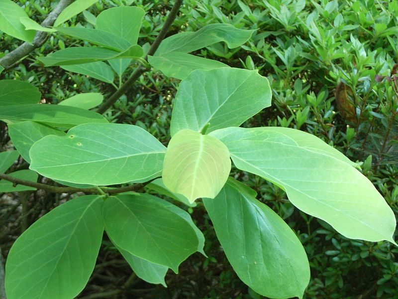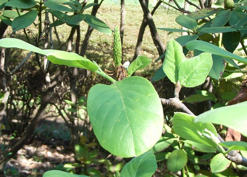 葉は全縁の倒卵形で、モクレンの葉より幅広でかつ大きい。