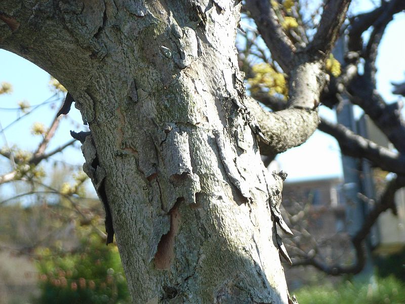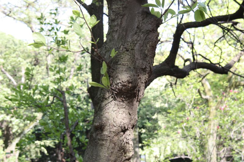 樹皮は灰白色。若木は滑らかであるが、老木になるとごつごつする。