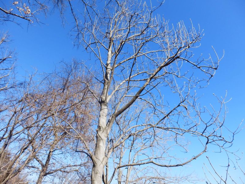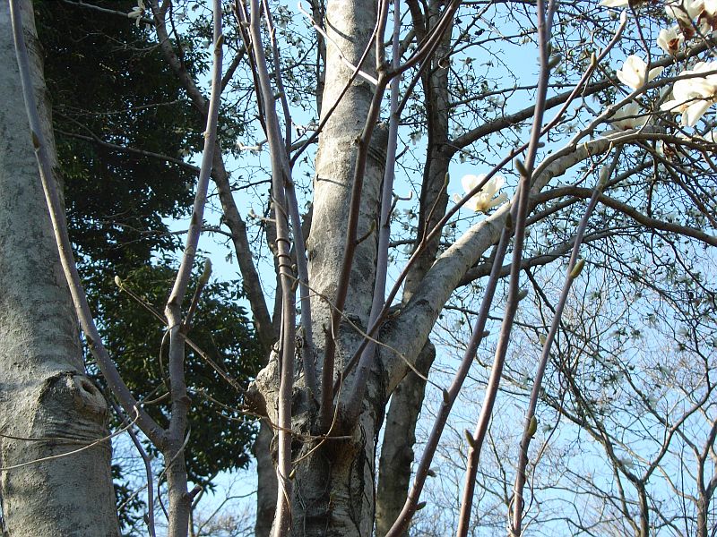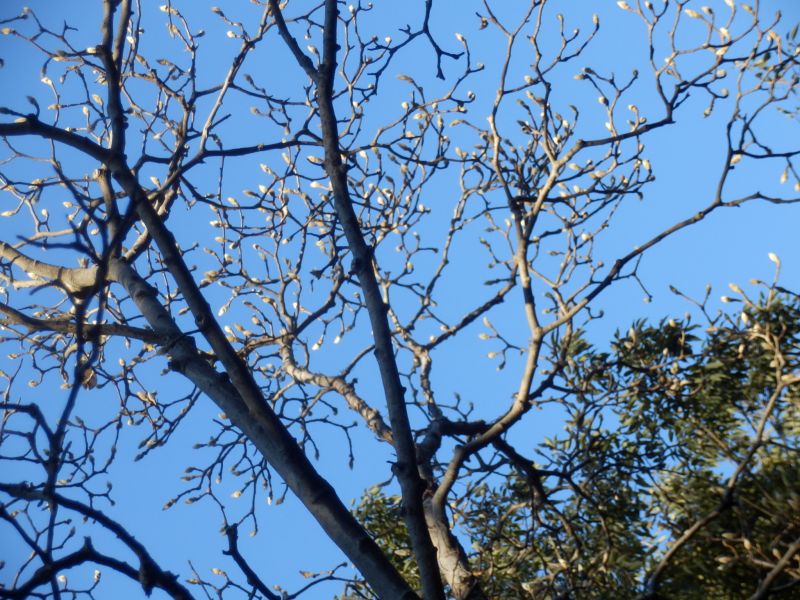 開花前は葉は皆無で、蕾だけがある。(手前の黒い幹は別の木。)
