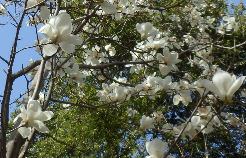 ハクモクレン:花弁は6枚で上向きに半開。色は白、葉は倒卵形。