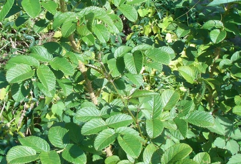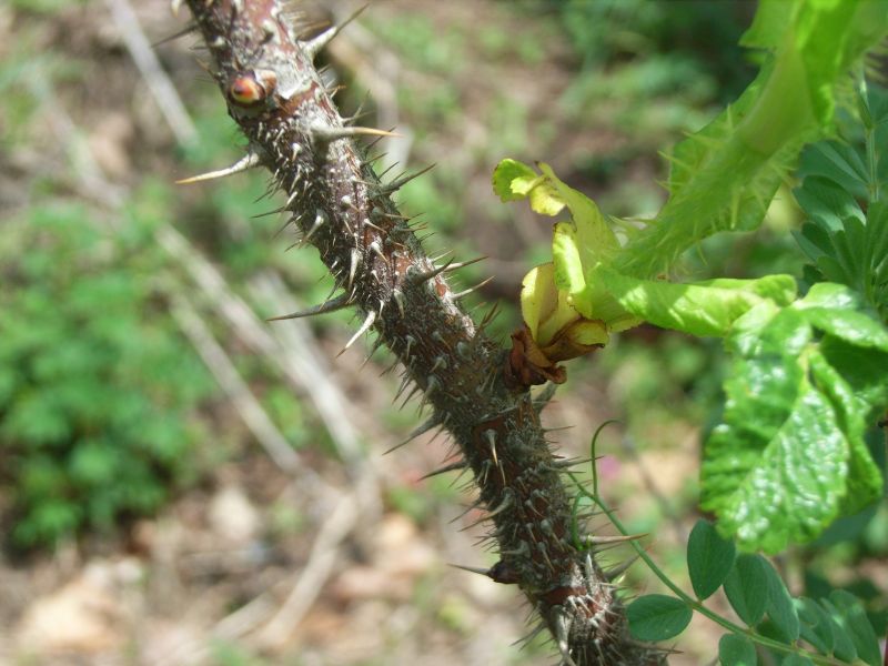 枝に軟毛があり、太い扁平な棘と細い針のような棘が混ざり合って