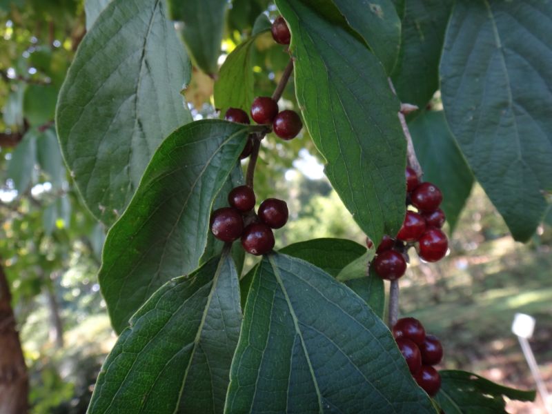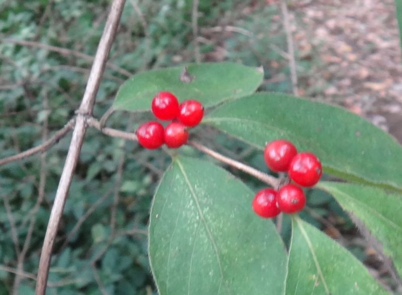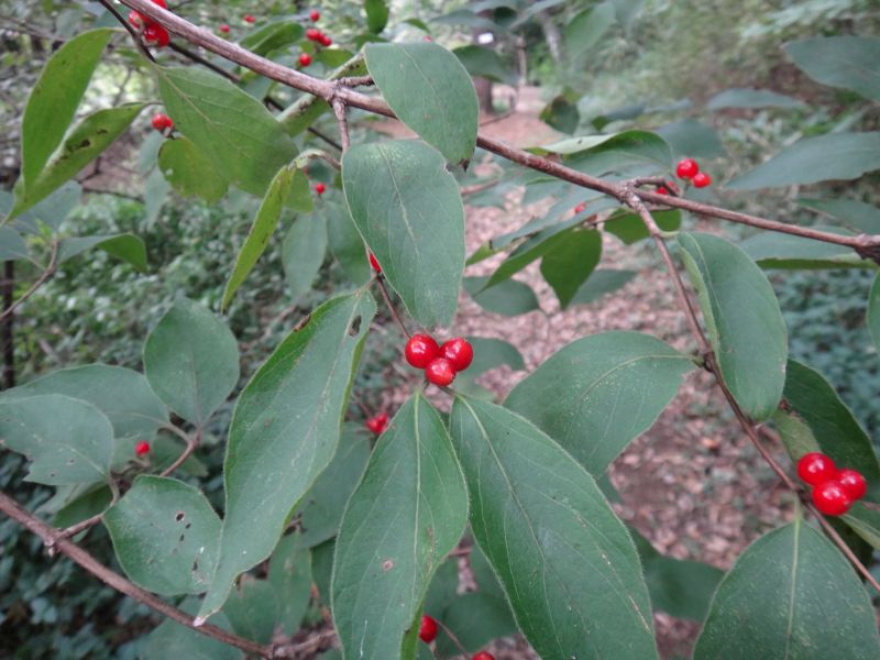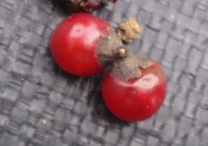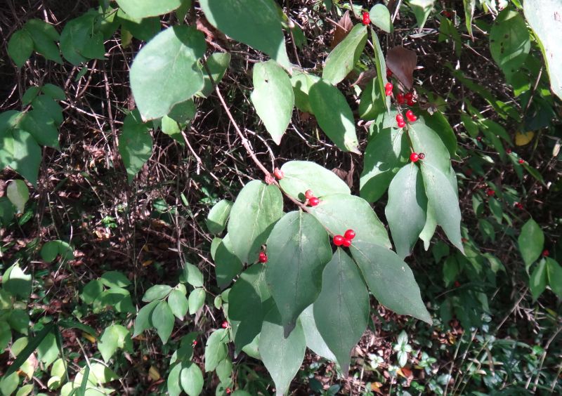 丸い液果が赤熟する。2つずつ並ぶが、1つのこともある。