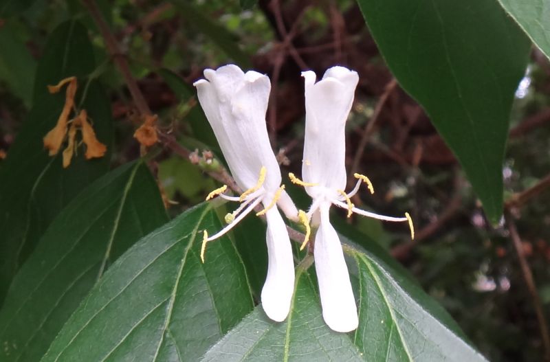 ハナヒョウタンボク:葉は長楕円形でとがる、花は唇形、果実は合着しない。