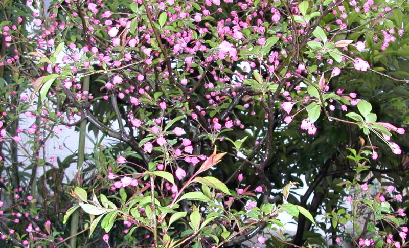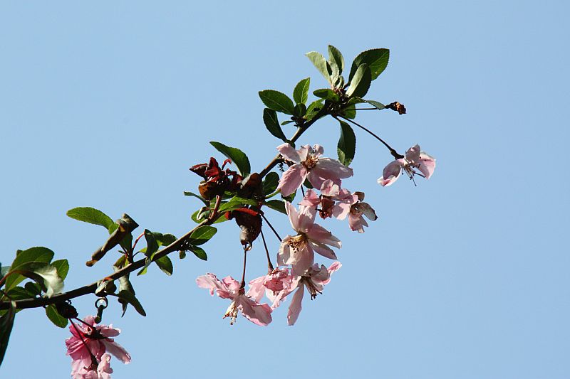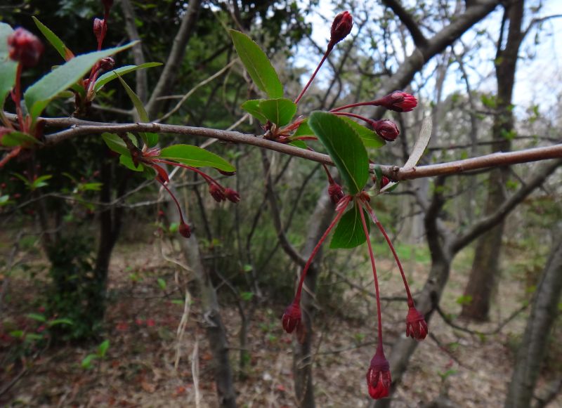 短枝の先に、直径3.5〜5ミリで、長い柄のついた花が散形状に垂れ下がる。