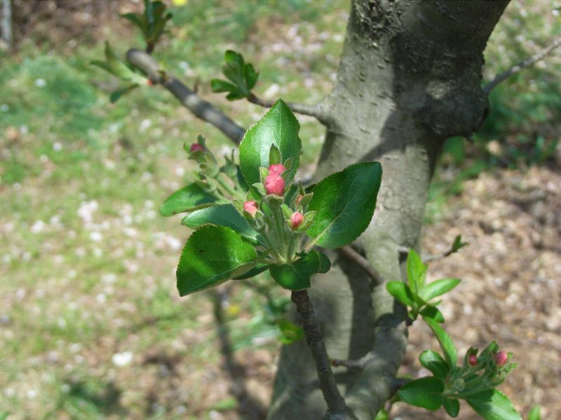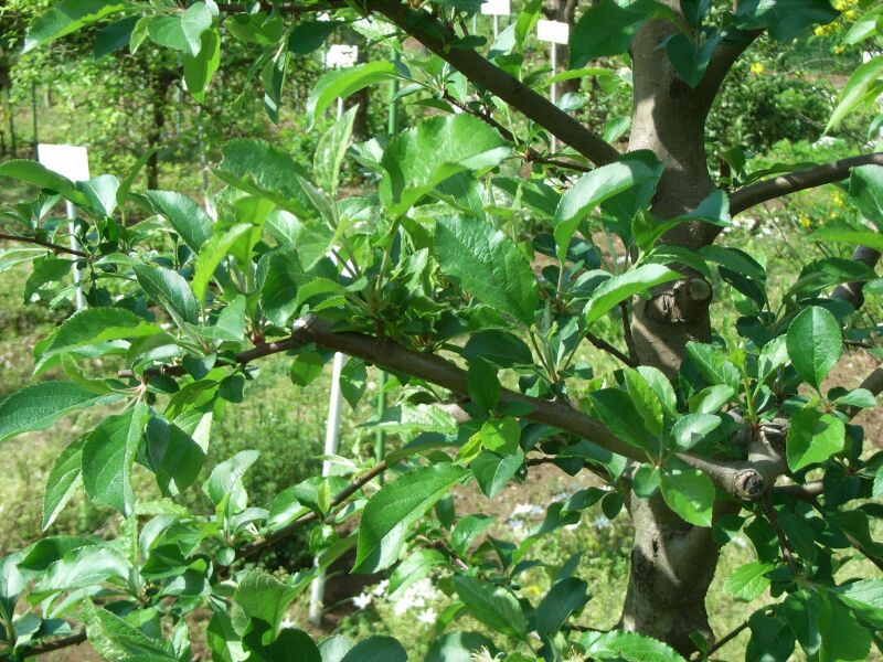 葉は短枝から多く出て、楕円形〜卵形で互生する。