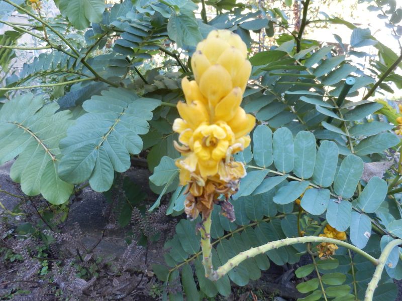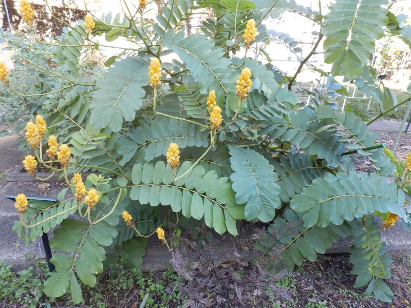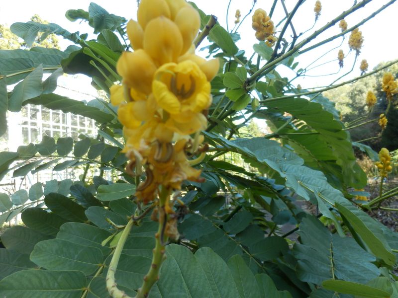 ハナセンナ:枝先から数本の花茎が湾曲して広がり、その先に黄色い花が総状に咲く。