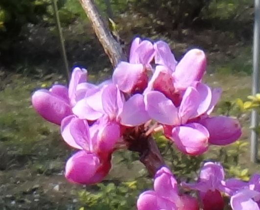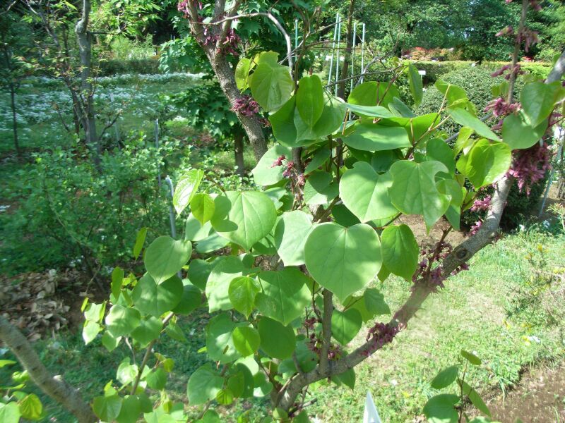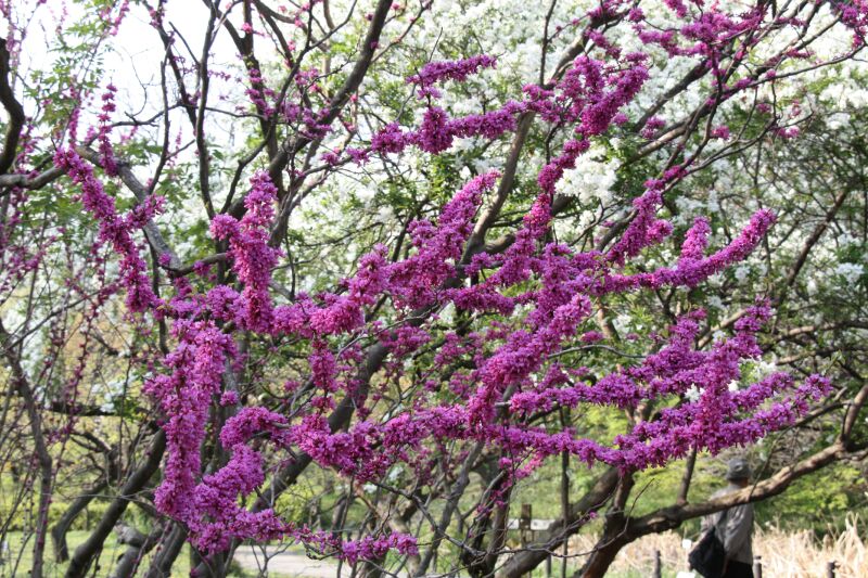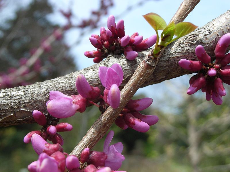 葉の展開前に前年枝や少し古い枝に紅紫色の蝶形花が束生する。