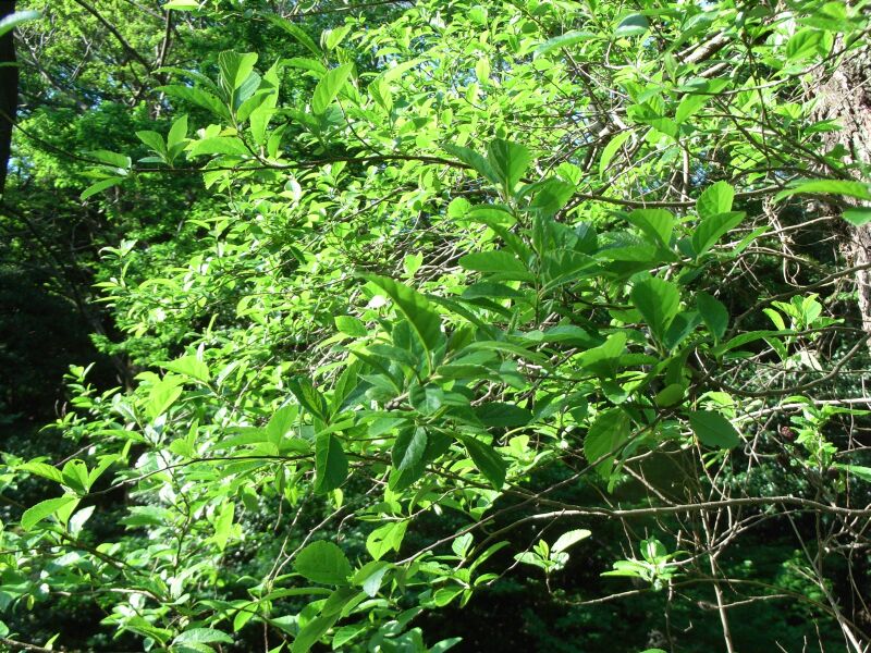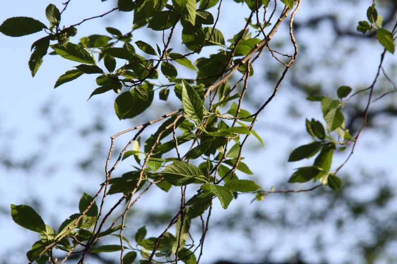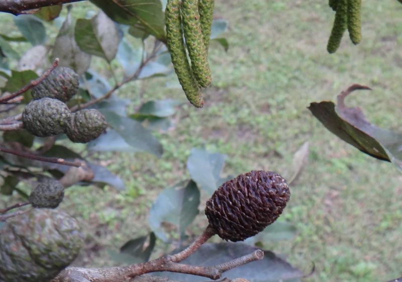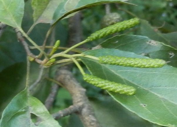 ヤシャブシ :葉は狭卵形で先が尖る、細重鋸歯、側脈分枝せず、雄花序太くて湾曲し黄緑色。