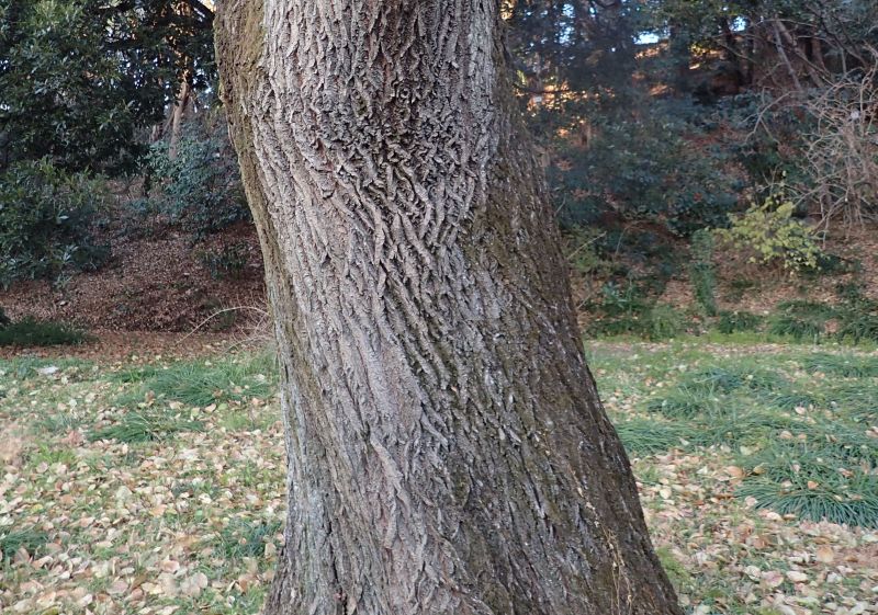 幹は太くなり、樹皮は灰褐色で縦の裂け目がある。