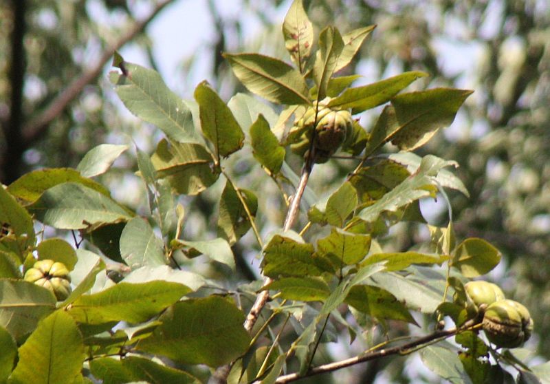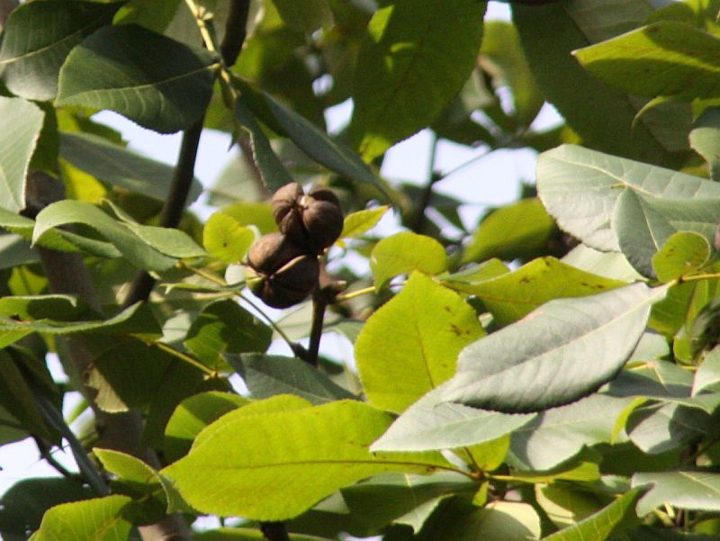 ペカン :奇数羽状複葉、小葉楕円形、雄花序下垂、雌花数個、殻果長楕円形。