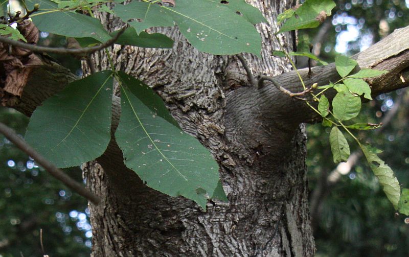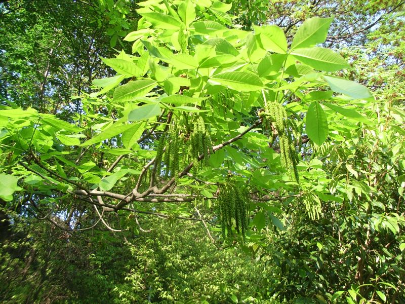 ヒッコリー :奇数羽状複葉、小葉長楕円形、雄花序下垂、雌花数個、核果状外種皮裂開。
