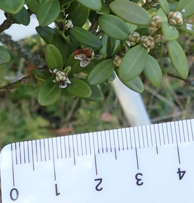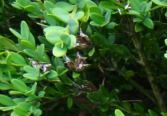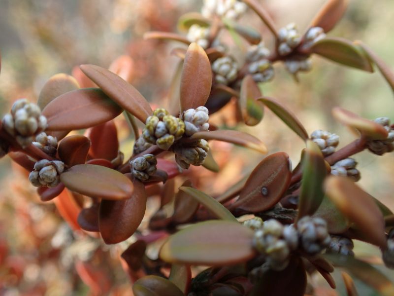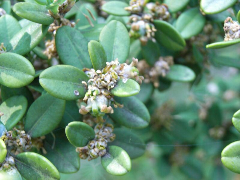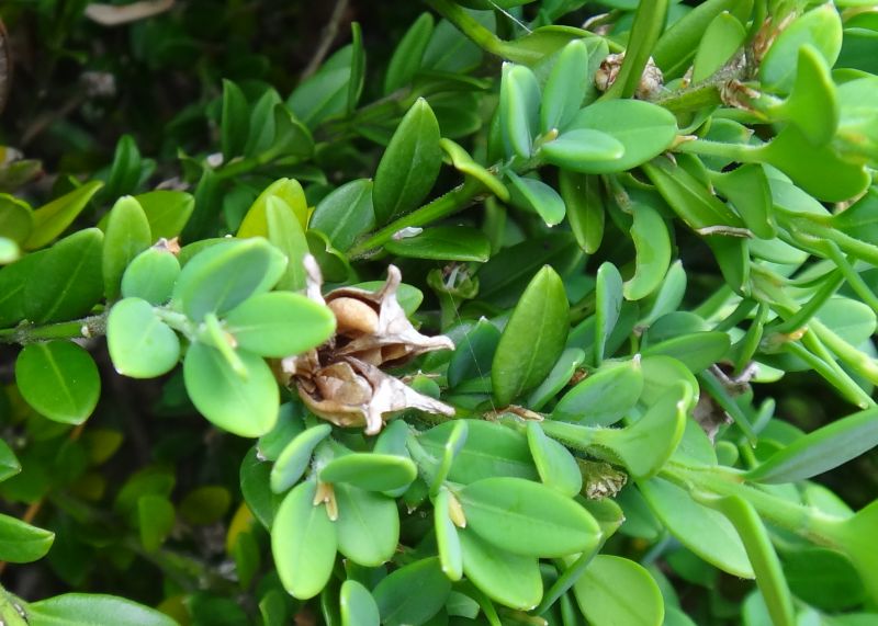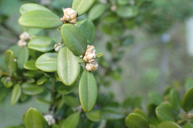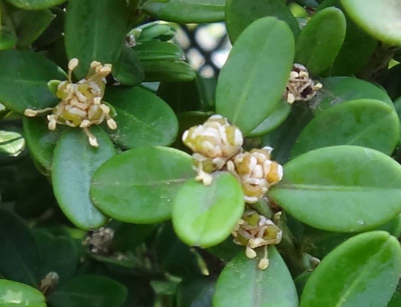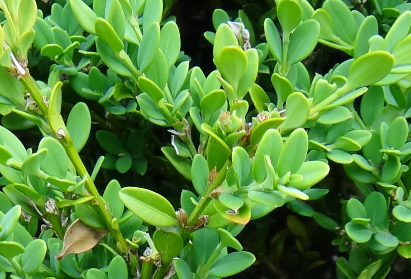セイヨウツゲ:低木、葉は2.5センチの倒卵形で全縁、先があまりへこまず、対生する。ツゲ科。