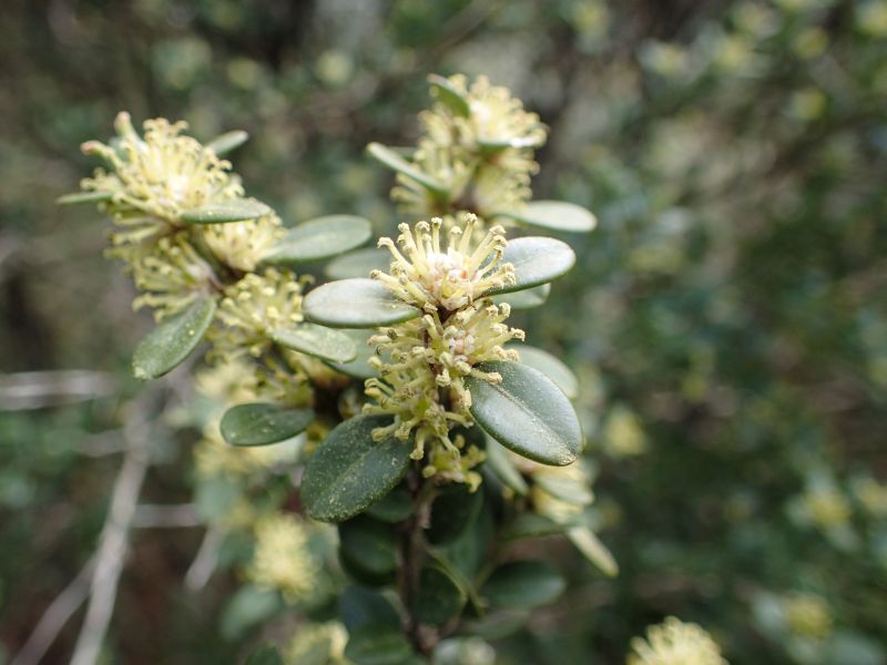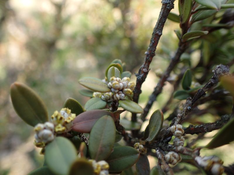 ヒメツゲ :低木、葉は2センチ以下の倒卵形で全縁、鈍頭、対生する。ツゲ科。