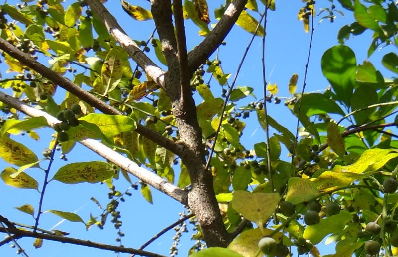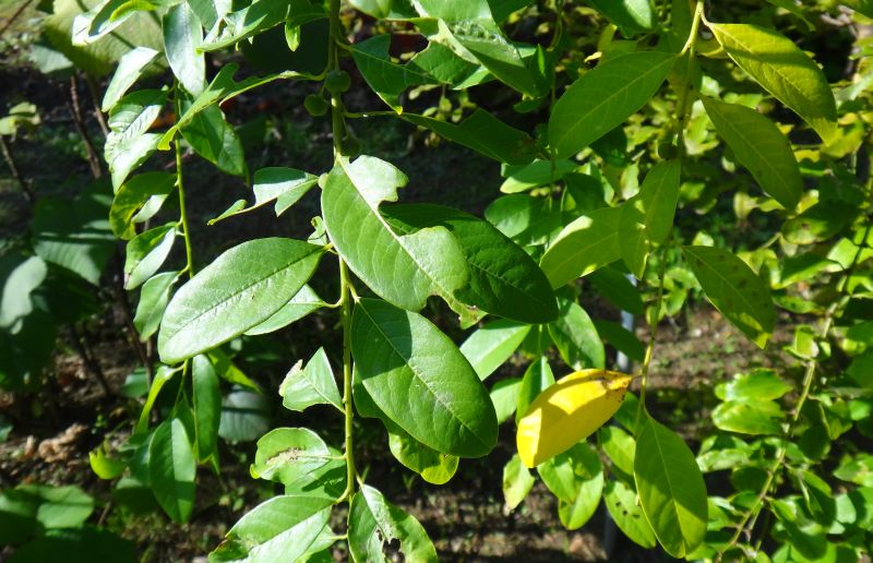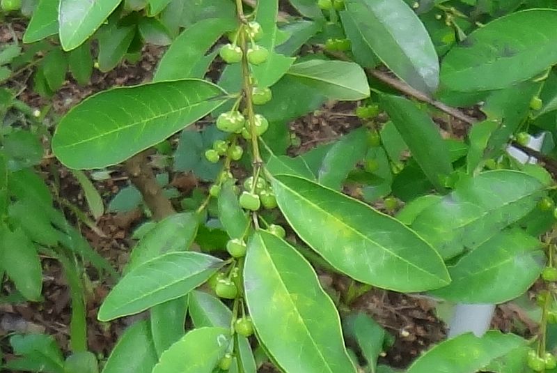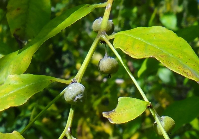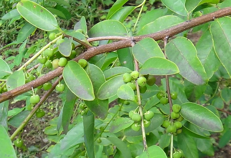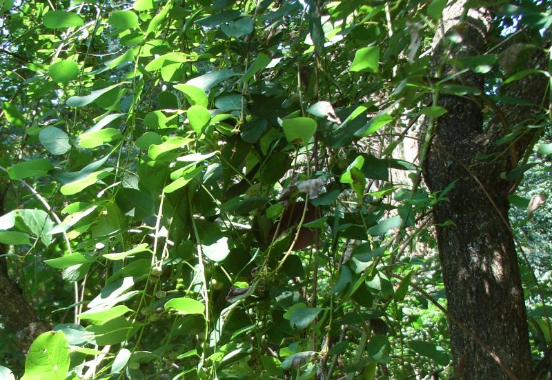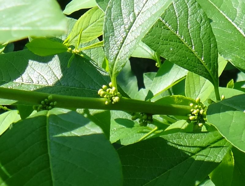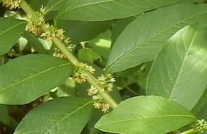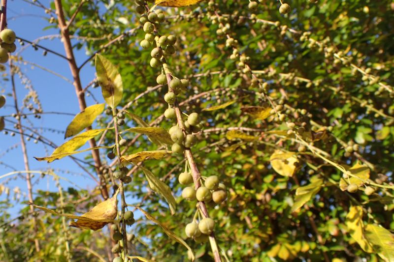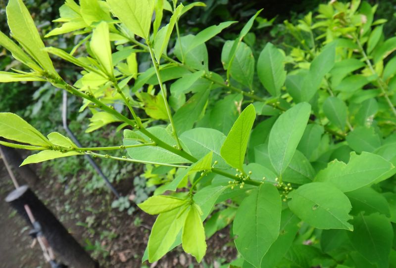 雌雄異株で、夏に葉腋に淡黄緑色の小さい花が咲く。