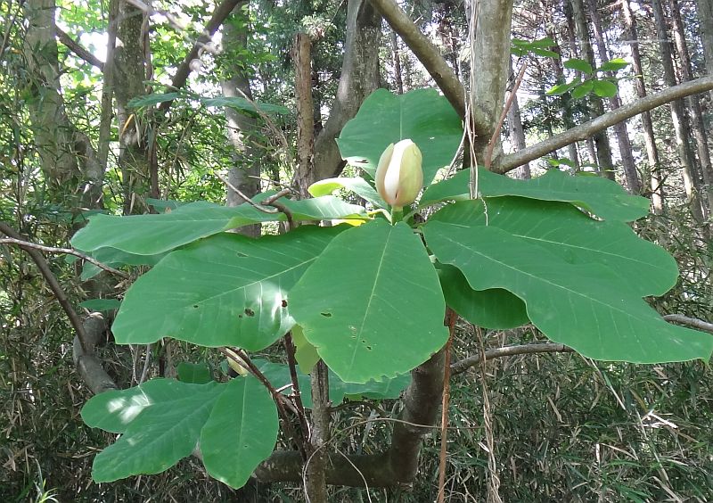 葉は倒卵形で長さ40センチにもなり、葉裏は白色を帯び、