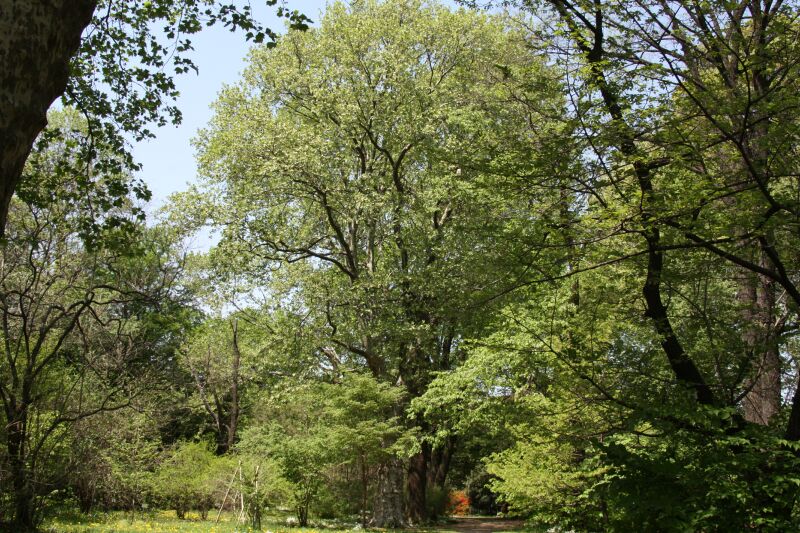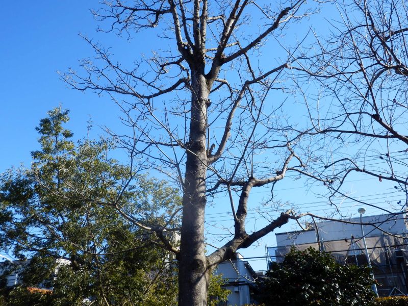 幹は直立し、枝を放射状に出し、樹皮は灰白色で皮目がある。