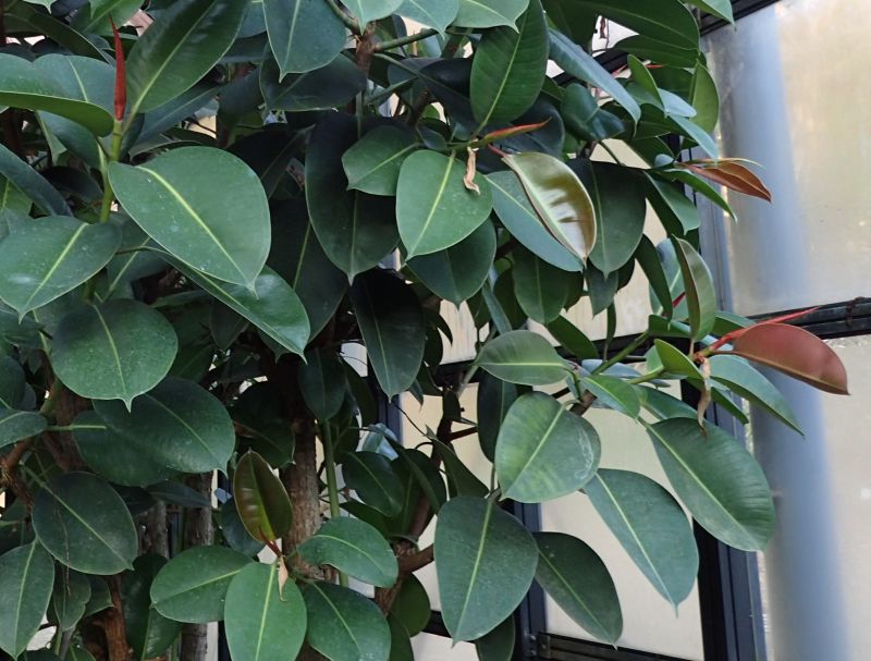 葉は互生し、厚い楕円形で光沢があり、長さ15センチ以上になる。