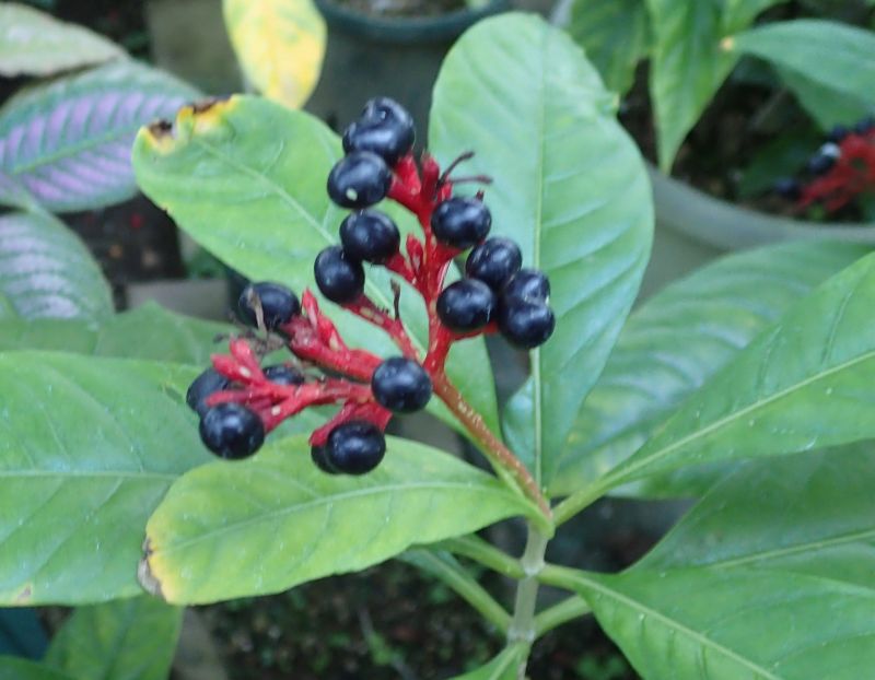 丸い果実が黒く熟す。花序枝は赤い。
