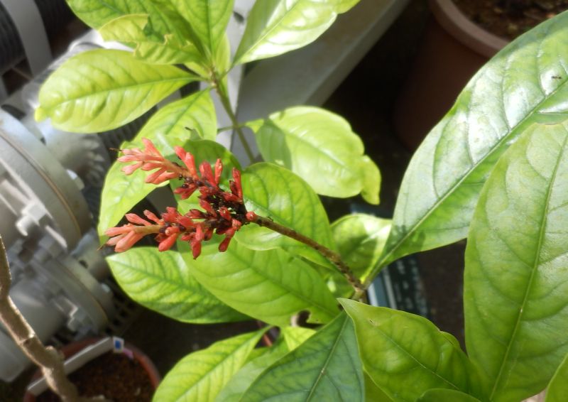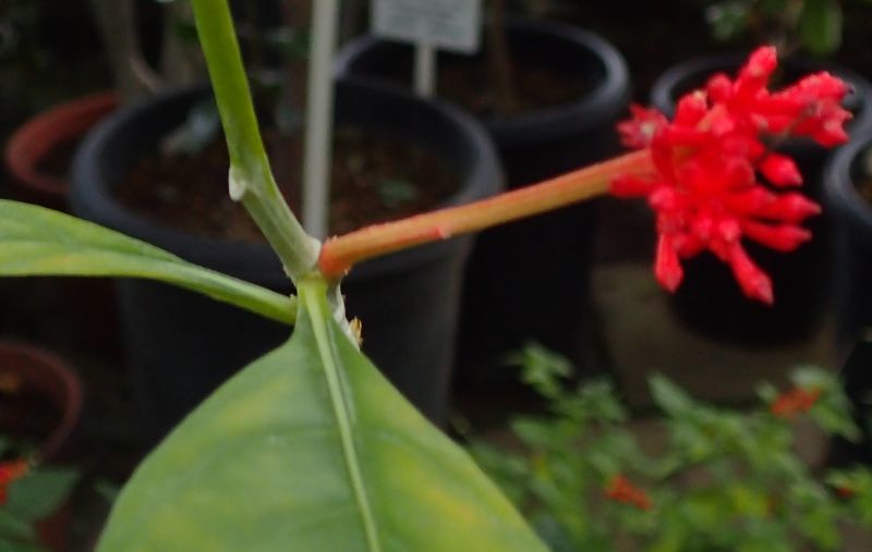 葉腋から長い花柄が出て、複散房花序の赤い蕾がつく。