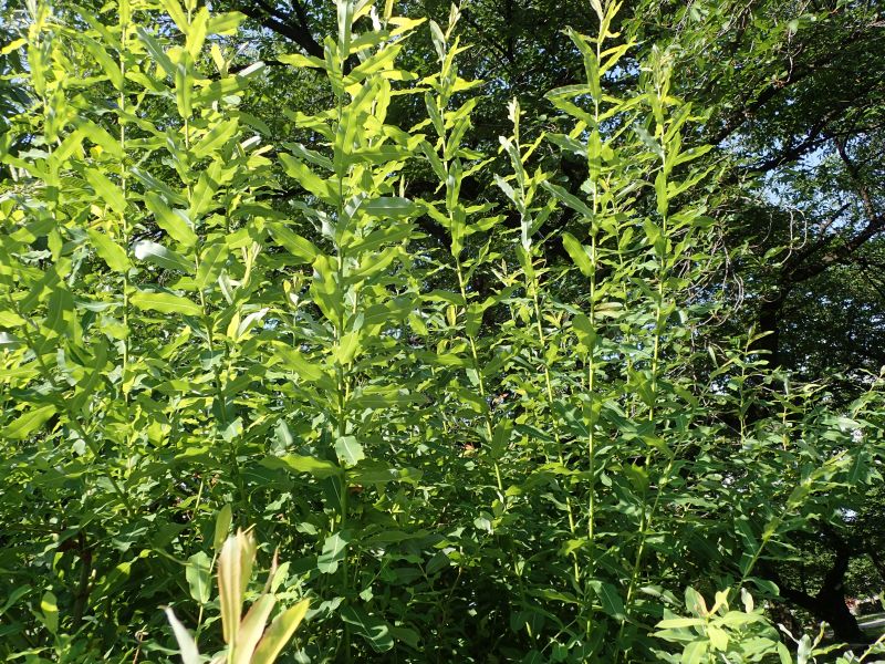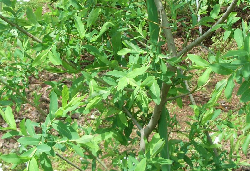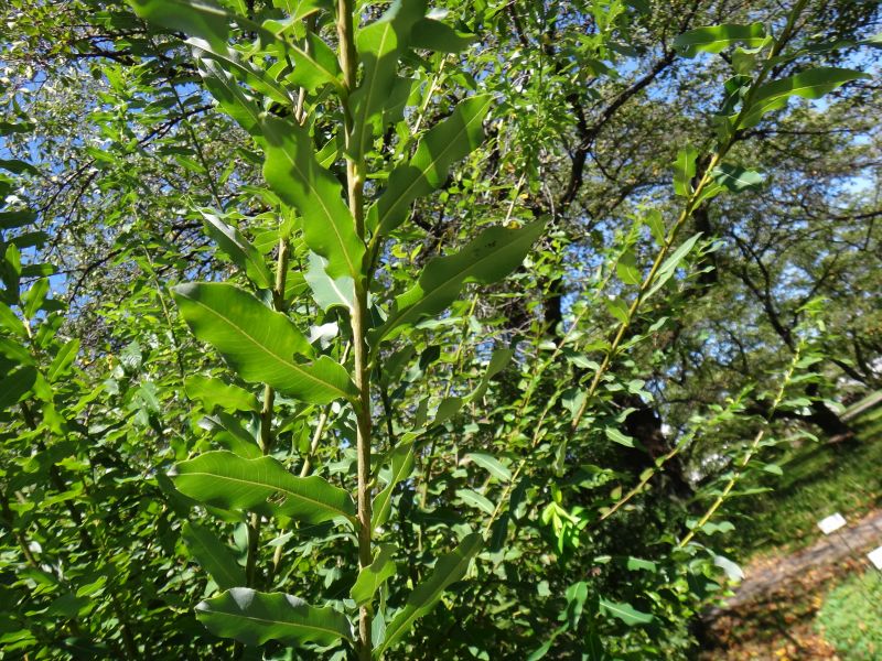 葉裏は淡緑色。互生する葉もある。この枝ではごく短い葉柄がある。