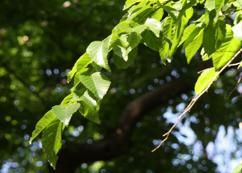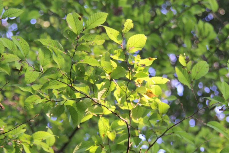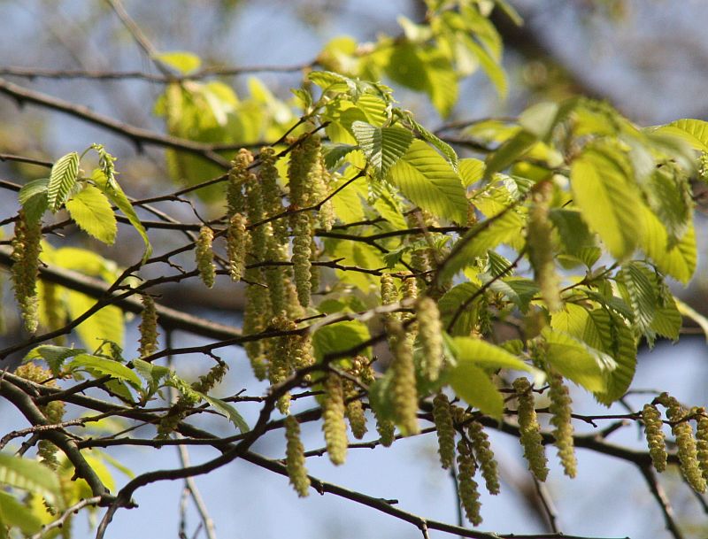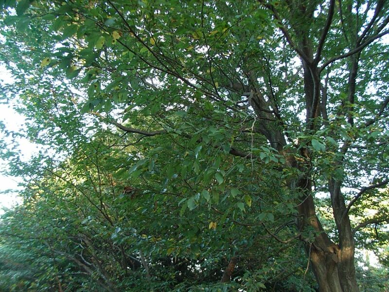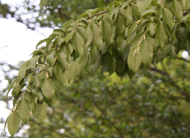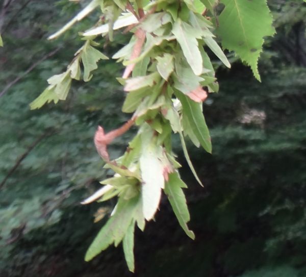 クマシデ:葉が細長く先が尖る、葉柄に軟毛、雄花黄緑色、果穂閉じる。