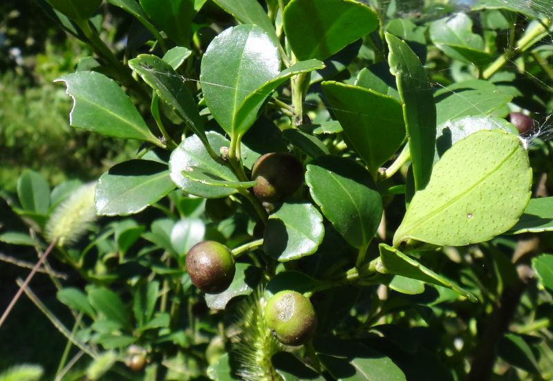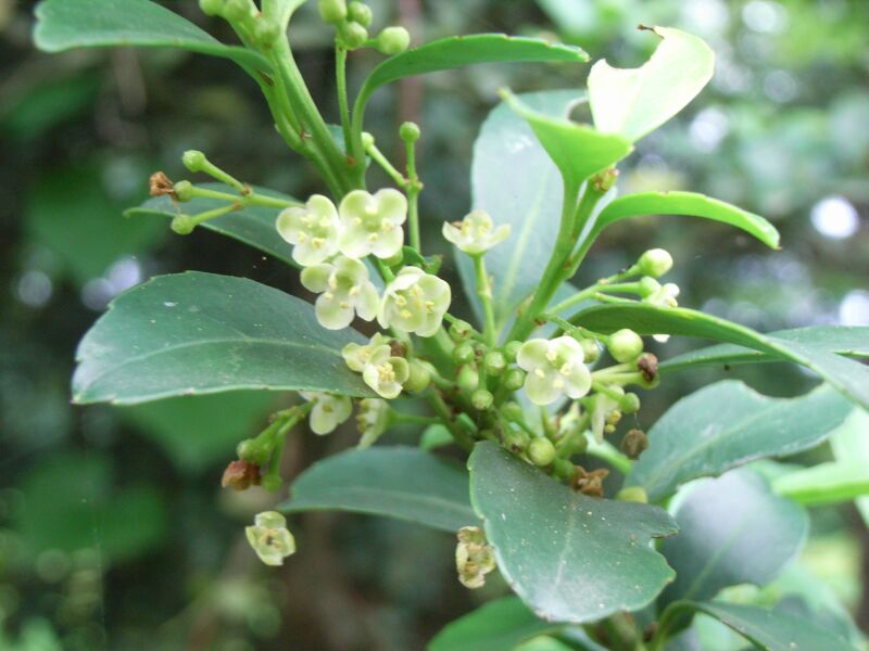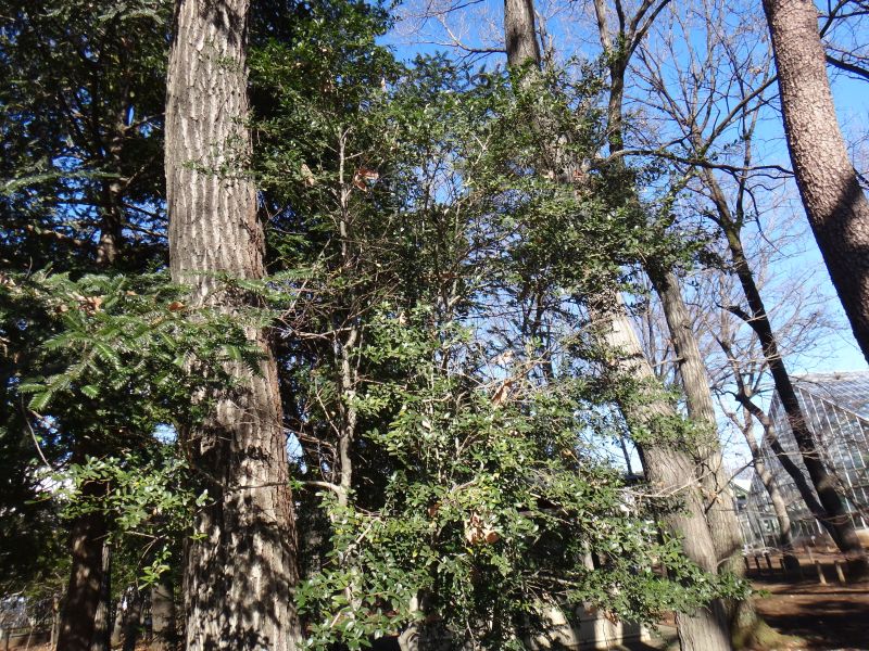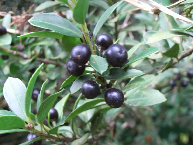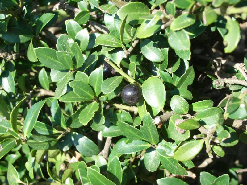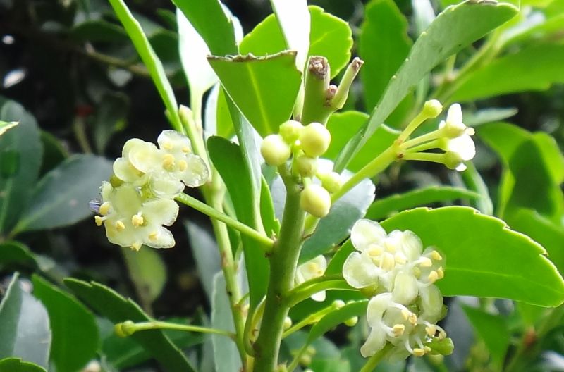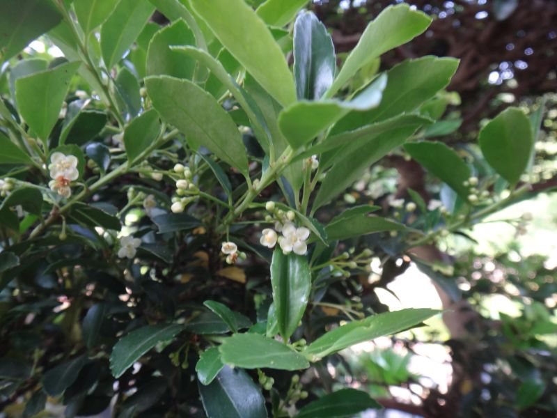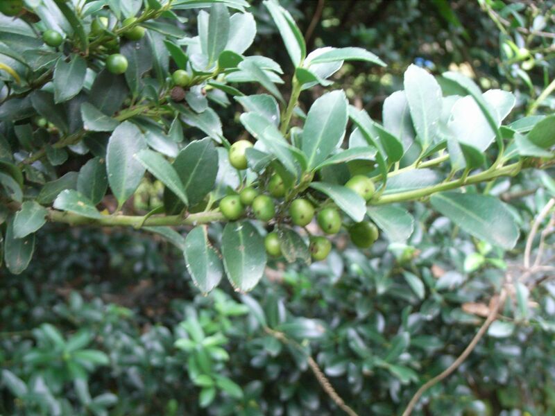 イヌツゲ :低木、葉は3センチ以下の長楕円形で浅い鋸歯があり、先はへこまず、互生する。モチノキ科。