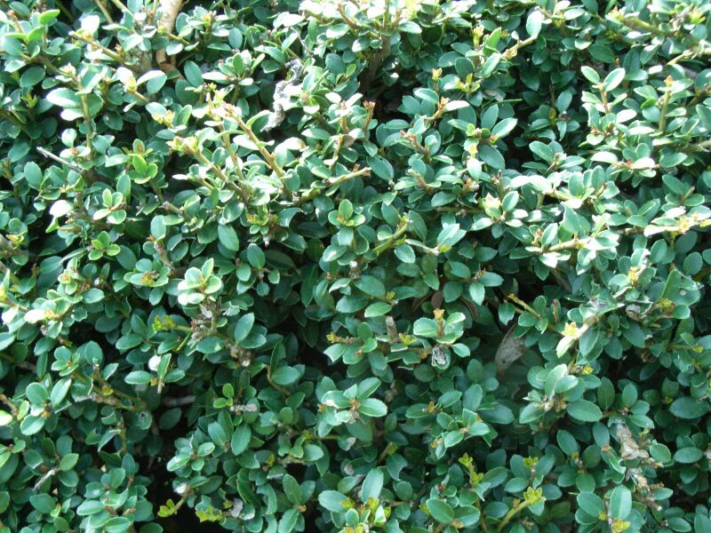セイヨウツゲ:低木、葉は2.5センチの倒卵形で全縁、先があまりへこまず、対生する。ツゲ科。