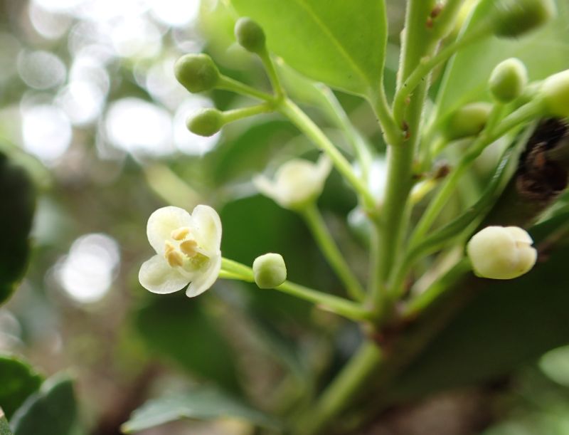 雌雄異株で、雄株では、夏に本年枝の葉腋から出る散形花序に、