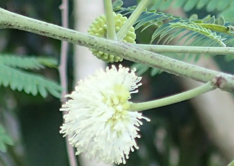 枝先の葉腋に淡黄白色の花が数十個頭状にかたまって咲く。