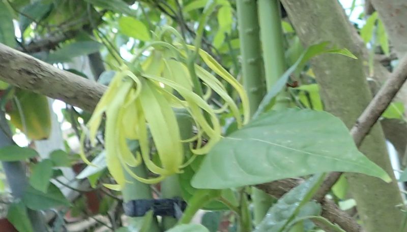 枝先に長さ数センチの柄のある数個の花を咲かせる。花弁は10枚ぐらいあって、黄色く、細長くのびてくねる。