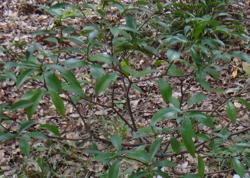 葉は先のとがった楕円形で光沢があり、枝先にジンチョウゲに似た花が咲き、 丸い液果がつく